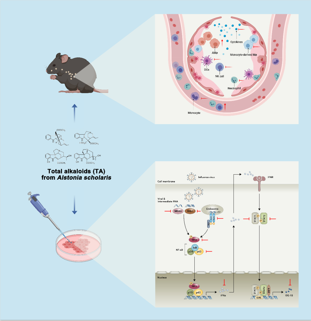 研究团队通过高分辨率质谱法对TA中的生物碱进鉴定,确认TA中主要成分为中鸭脚树叶碱、瓦莱明碱、灯台树次碱、19表灯台树次碱。TA对甲型流感病毒及其诱导的炎症因子表达具有显著的体外抑制活性。口服TA对感染H1N1的小鼠表现出明显的死亡保护作用,且有效抑制小鼠肺部病毒复制和促炎因子的产生;TA可调节肺部固有免疫细胞失衡,表现为降低感染小鼠肺部的单核细胞来源巨噬细胞、树突状细胞和中性粒细胞的比例,改善肺泡巨噬细胞的耗竭。TLR-3、RIG-I和IFN信号通路相关分子是TA的可能靶点。