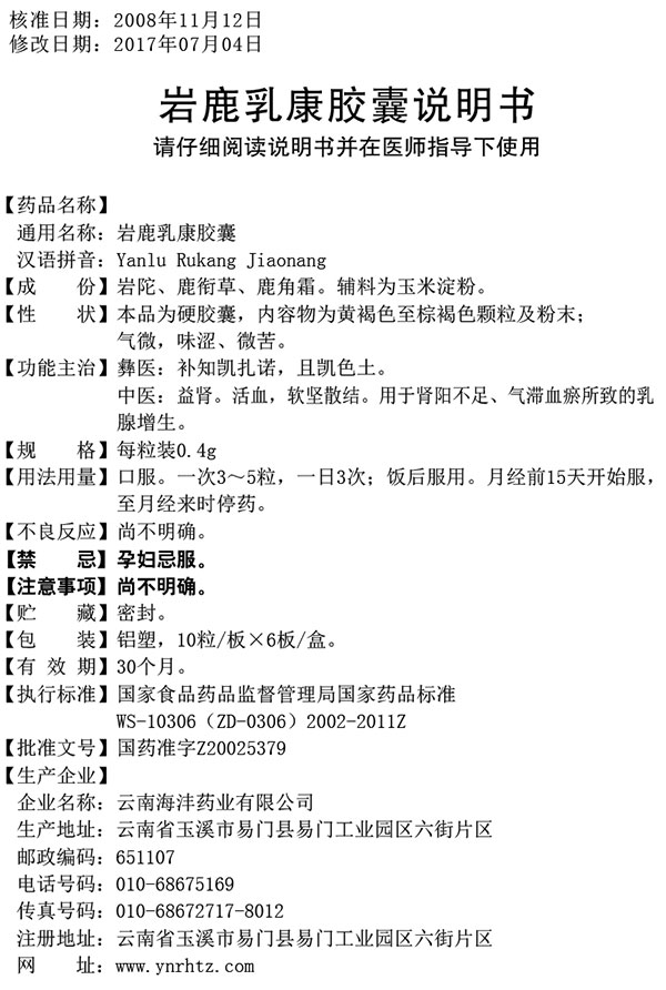 【通用名】岩鹿乳康胶囊