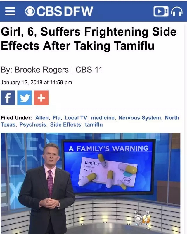 人民日报海外版2018年1月16日官方网站报道:美国德克萨斯州一名6岁女童,因流感口服奥司他韦治疗后产生幻觉,从学校逃课回到家中,从二楼卧室踩着桌子爬上窗口想跳楼,幸亏被父母及时发现救下。