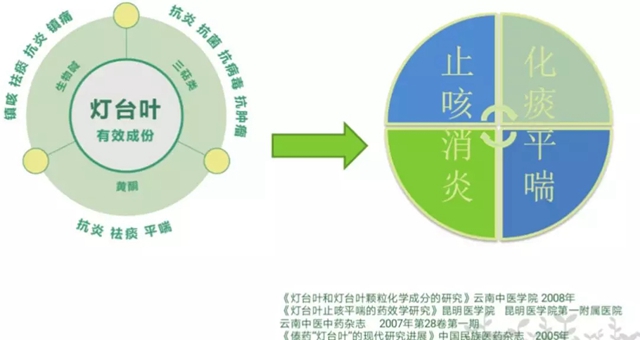 ♦灯台叶中含有80多种生物碱(多种吲哚类生物碱等)、三萜类化合物、黄酮化合物,多项研究指出,这些成分,具有全面的抗炎、抗菌、抗病毒,祛痰消炎止咳的作用。