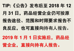 答:①2018年9月29日发布的《国家药品监督管理局关于药品上市许可持有人直接报告不良反应事宜的公告》(2018年第66号)(以下简称“公告”)。